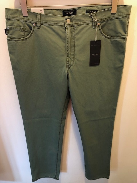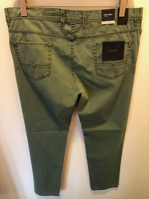Eine gut sitzende Hose der Marke Pionier. Die Hose hat Seiten- und Gesäßtaschen. Modell: Thomas. Farbe: grün. Material: 97 % Baumwolle, 3 % Elasthan.