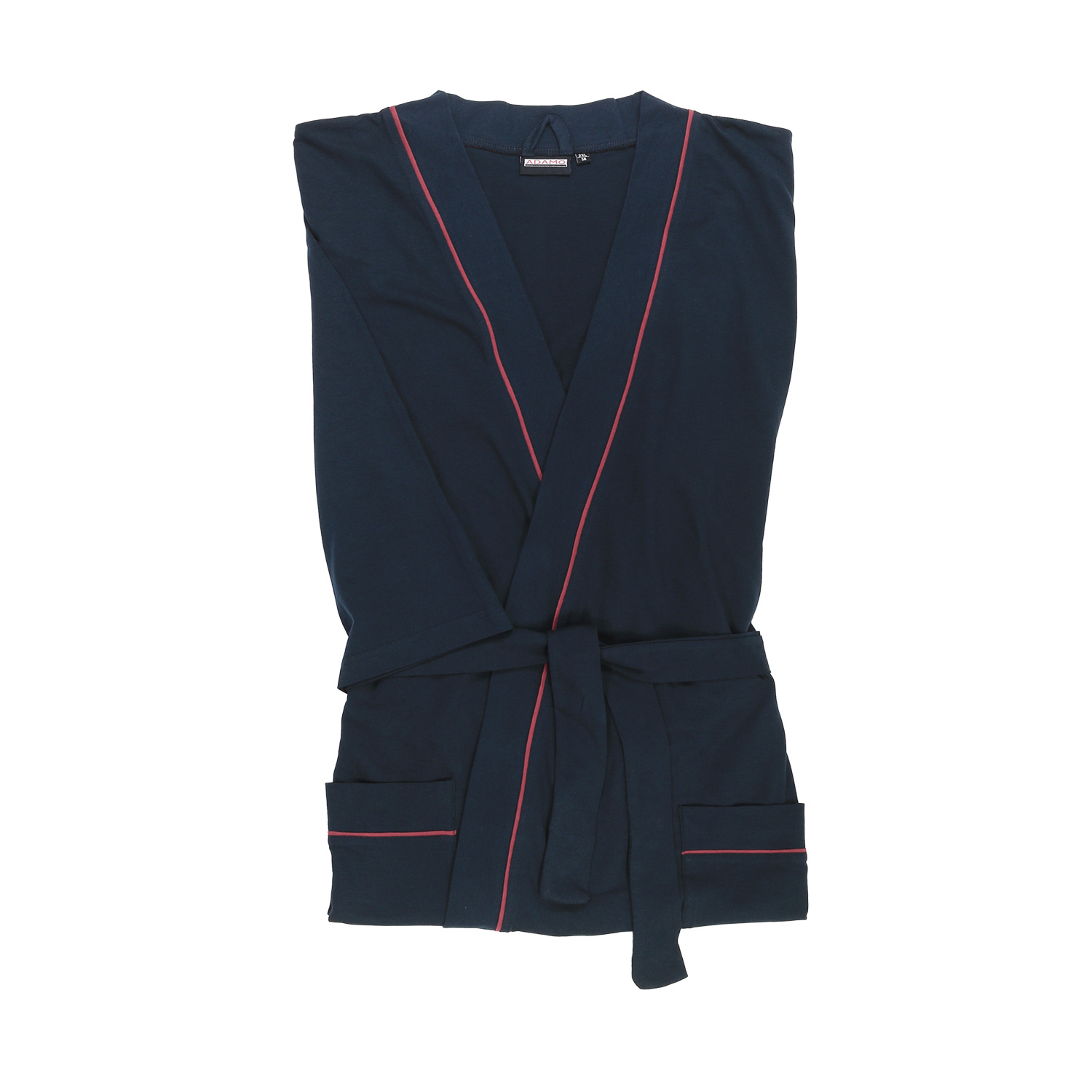 Ein dünner, leichter Bademantel der Marke Adamo in der Farbe Navy. Der Bademantel besteht aus 100 % Baumwolle und hat zwei Taschen auf der Vorderseite.