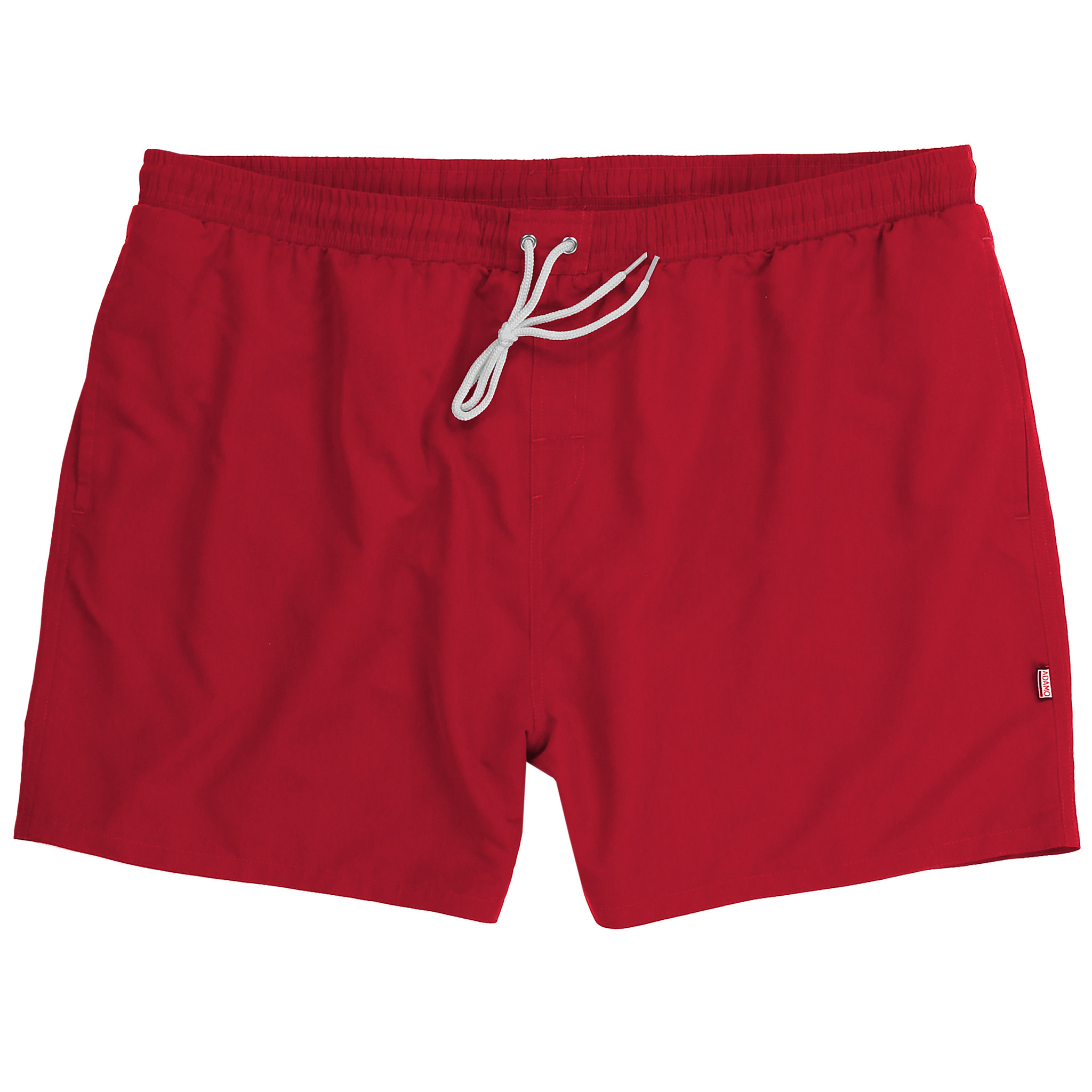 Eine rote Badeshorts mit kurzen Beinen, mit 2 Taschen und einer Gesäßtasche. Die Badeshorts haben außerdem einen Gummibund mit Kordelzug.