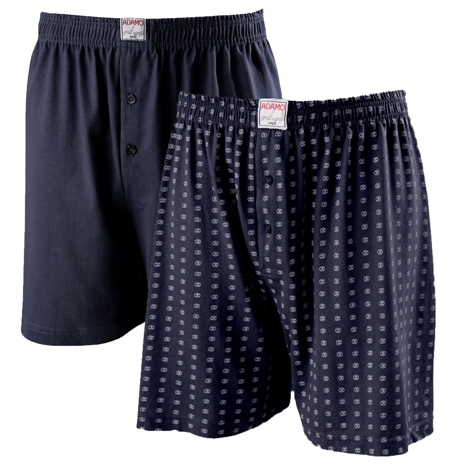2 Boxershorts der Marke Adamo, 1 in Marineblau und 1 mit Marinemuster. Bitte beachten Sie, dass es sich um ein hohes Modell handelt.