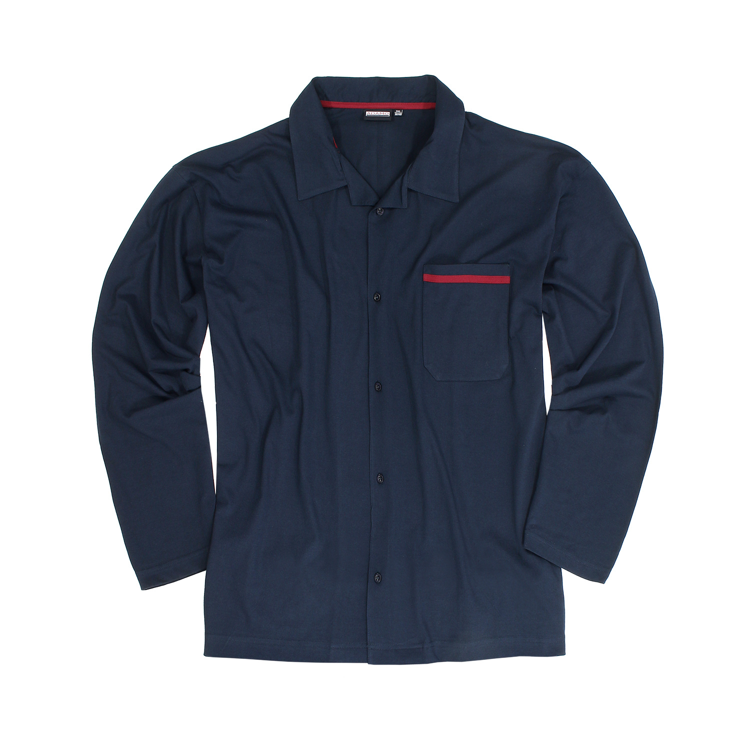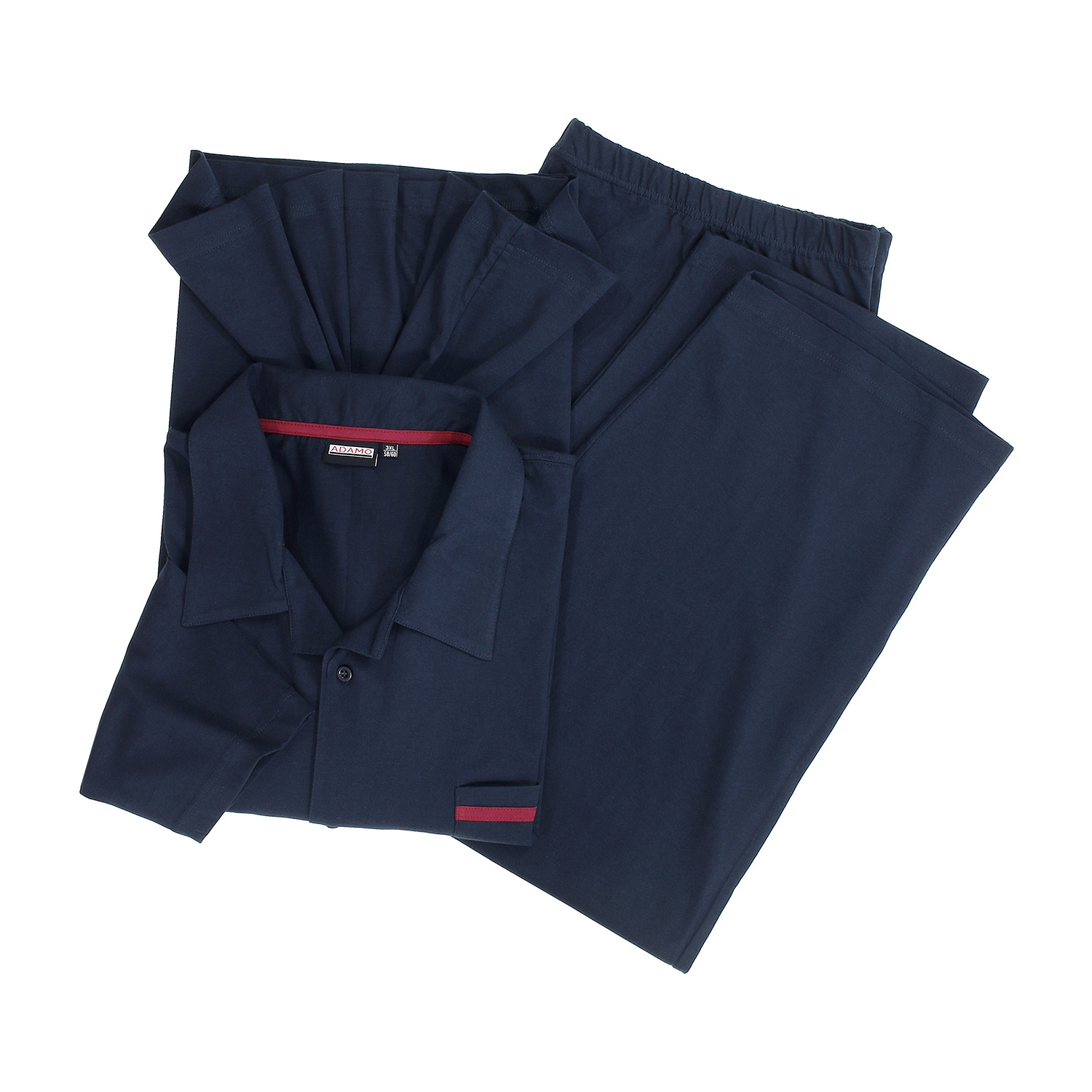 Ein Pyjama mit langen Ärmeln und Knopfverschluss am Hemd. Das Hemd hat zusätzlich eine Brusttasche. Die Hose hat eine Gesäßtasche. 100 % Baumwolle in der Farbe Marineblau.