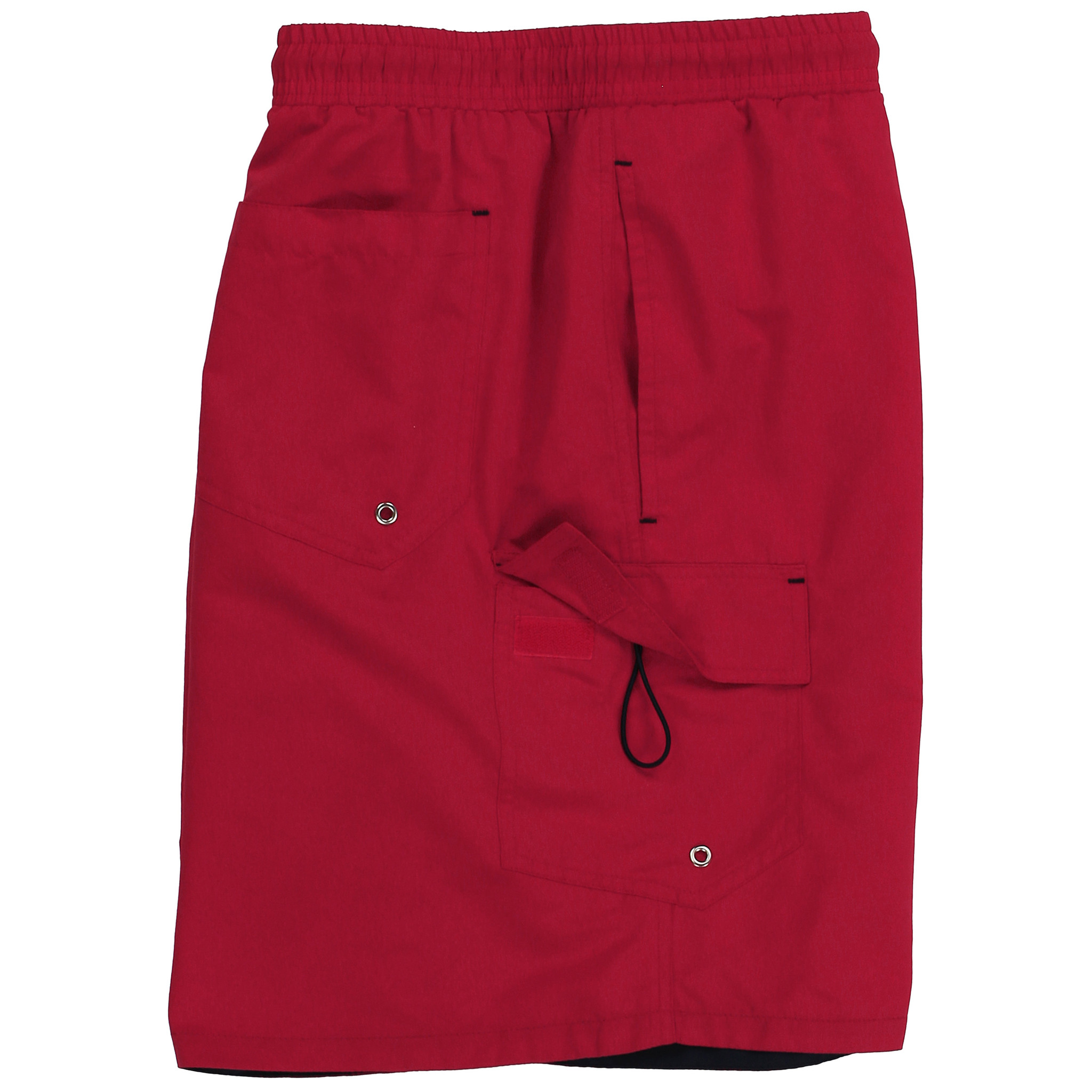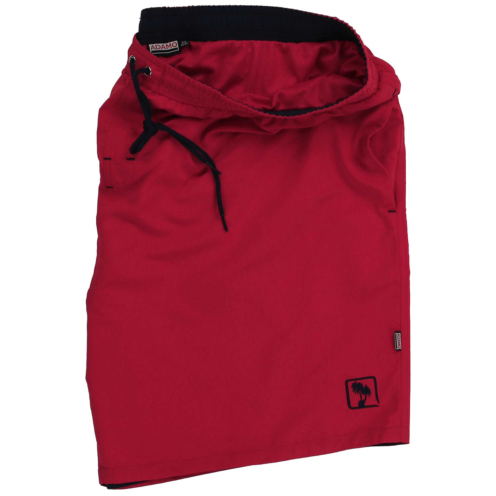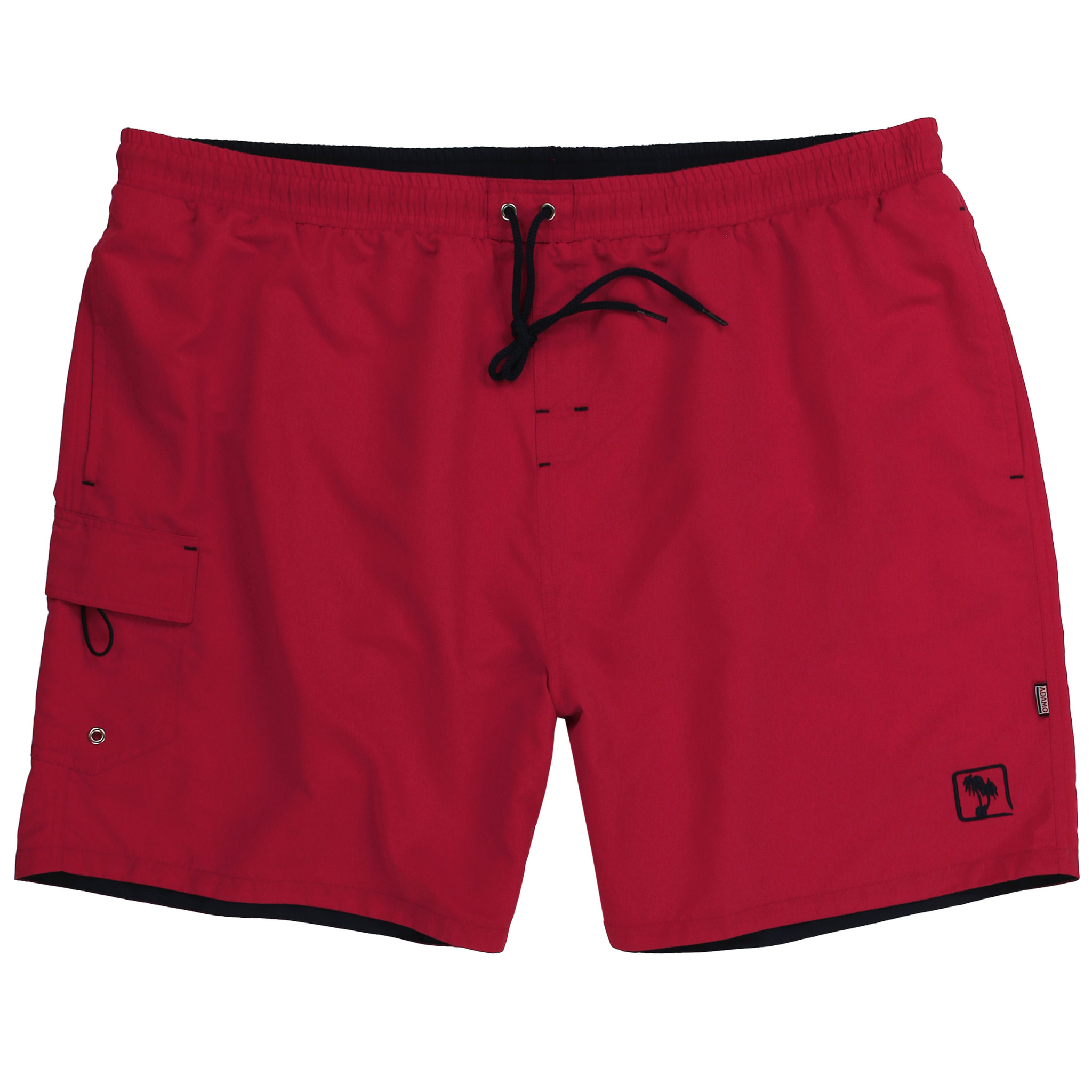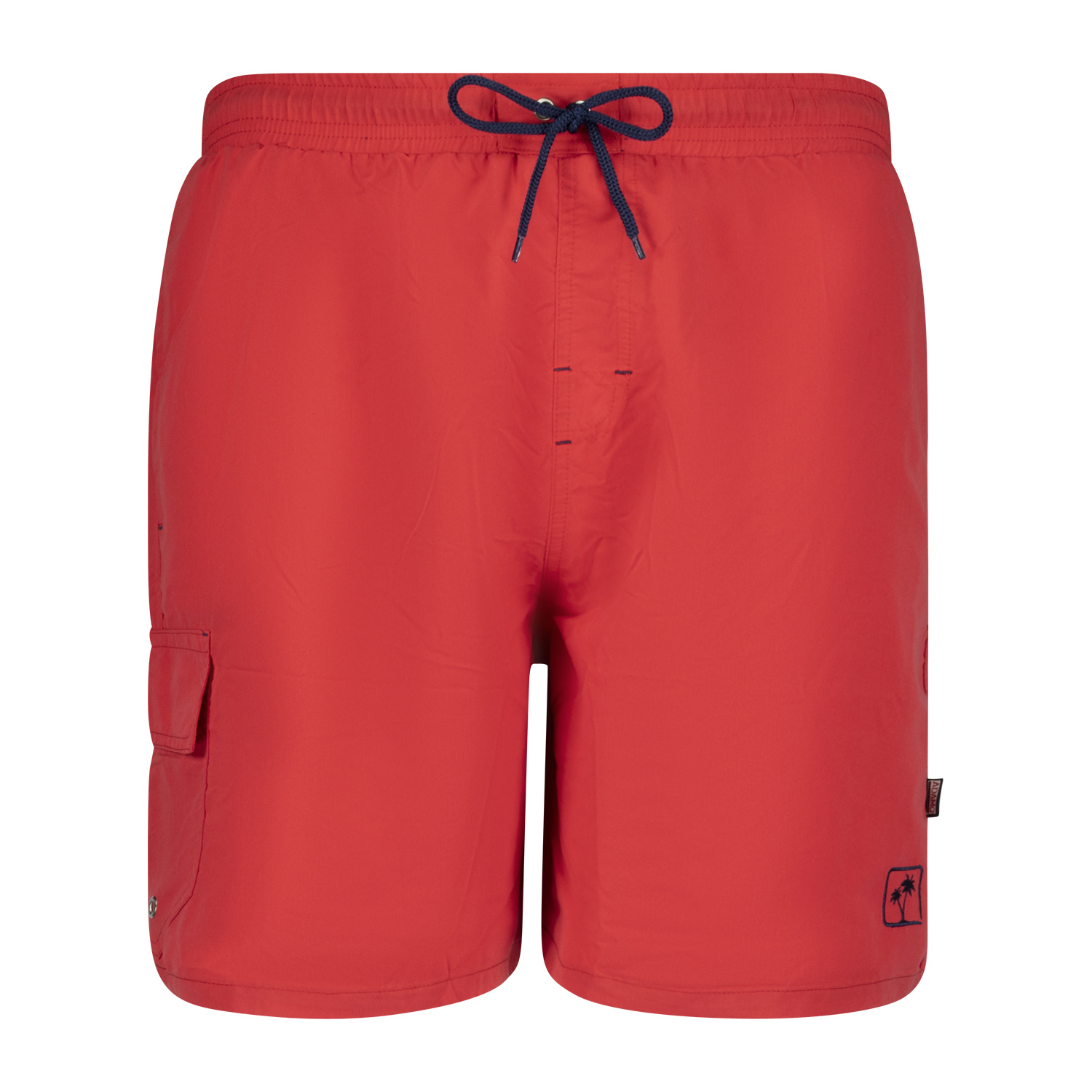Eine Bade-Bermuda in Rot mit kurzen Beinen, ausgestattet mit 2 Taschen und einer Gesäßtasche. Die Badeshorts haben außerdem einen Gummibund mit Kordelzug.