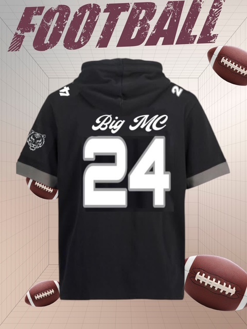 Ein cooler American Football Pullover Kurzarm in schwarz mit verschiedenen Prints (Badges) auf Vorder- und Rückseite sowie den Ärmeln. Eine limitierte Edition des Labels BigMC.