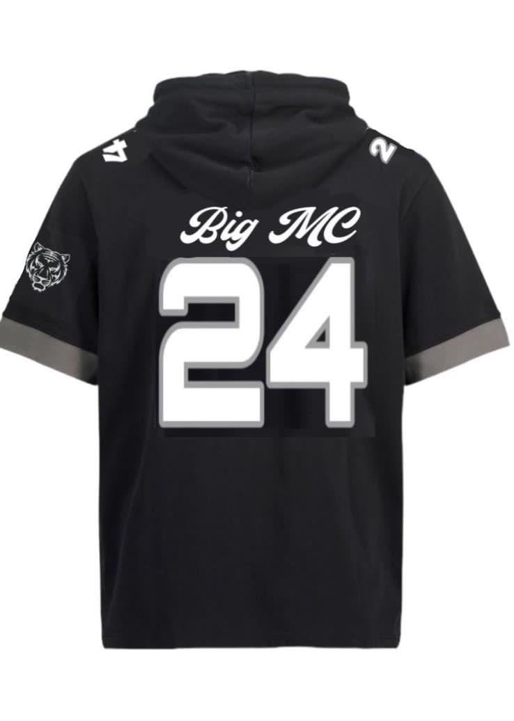 Ein cooler American Football Pullover Kurzarm in schwarz mit verschiedenen Prints (Badges) auf Vorder- und Rückseite sowie den Ärmeln. Eine limitierte Edition des Labels BigMC.