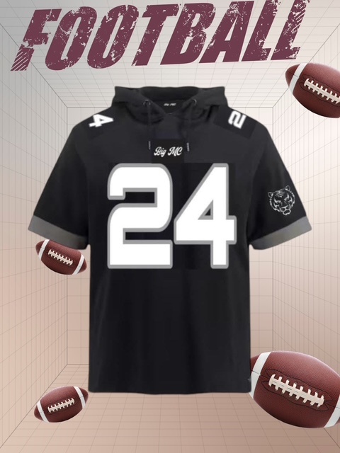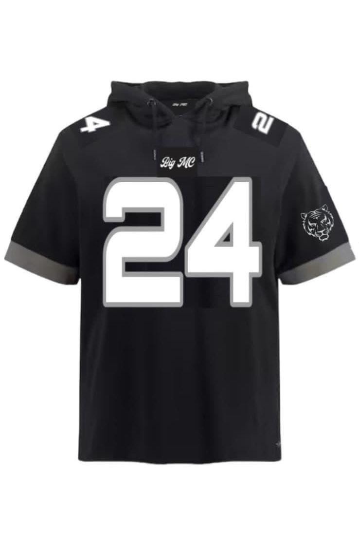 Ein cooler American Football Pullover Kurzarm in schwarz mit verschiedenen Prints (Badges) auf Vorder- und Rückseite sowie den Ärmeln. Eine limitierte Edition des Labels BigMC.