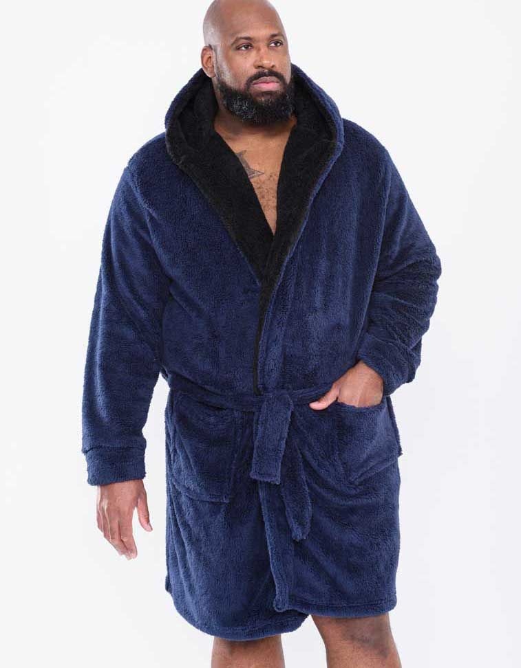 Ein wunderbar warmer Bademantel mit Taschen und Kapuze in Marineblau.