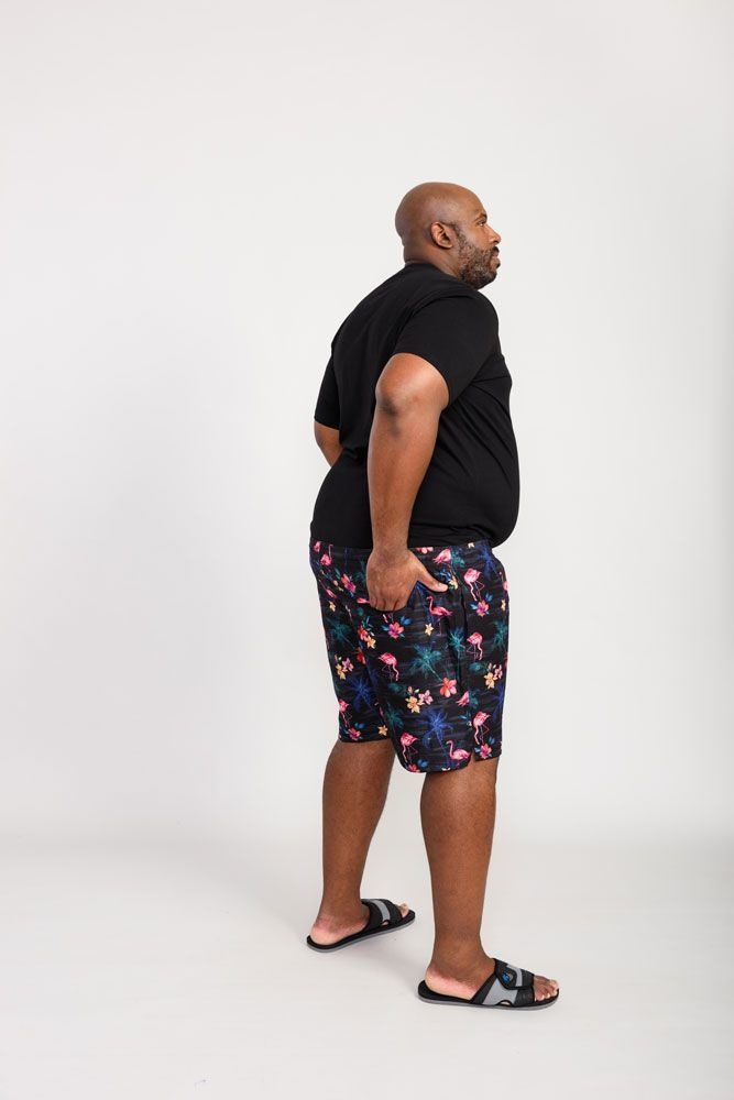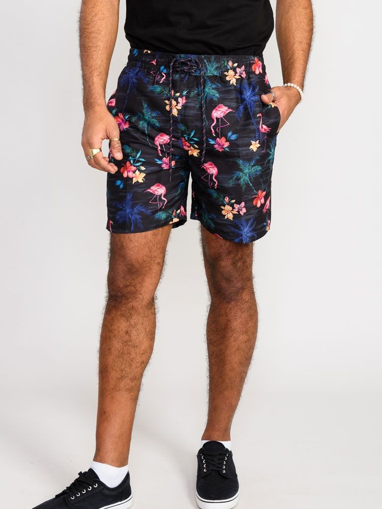 Tropische Badeshorts der Marke D555 mit Flamingo- und Palmendruck in Schwarz. Die Badeshorts verfügen über einen Gummibund und Kordelzug und haben 2 Seitentaschen und eine Gesäßtasche.