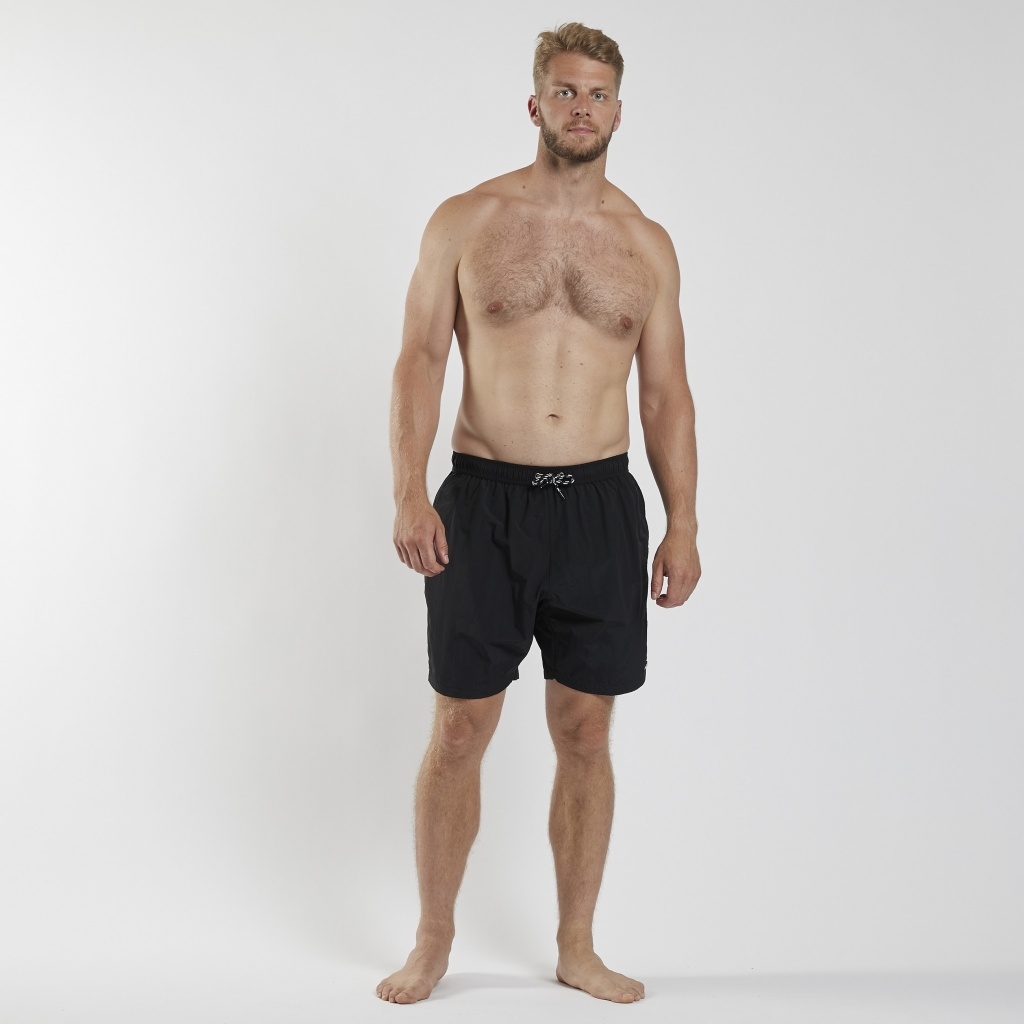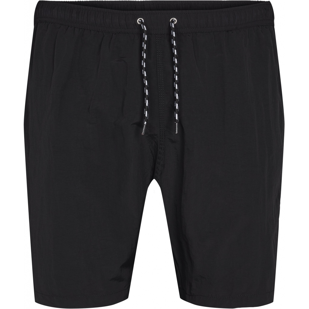 Schwarze Badeshorts von North Latitude. Sie haben einen elastischen Bund und einen Kordelzug. Außerdem haben sie Taschen.