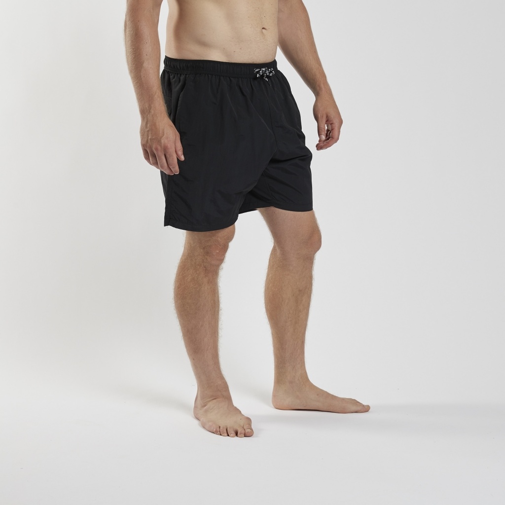 Schwarze Badeshorts von North Latitude. Sie haben einen elastischen Bund und einen Kordelzug. Außerdem haben sie Taschen.