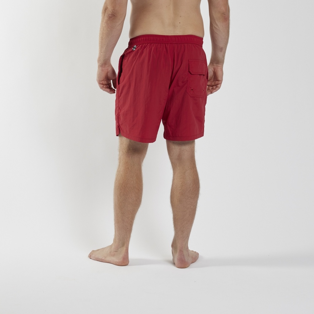 Rote Badeshorts von North Latitude. Sie haben einen elastischen Bund und einen Kordelzug. Außerdem haben sie Taschen.