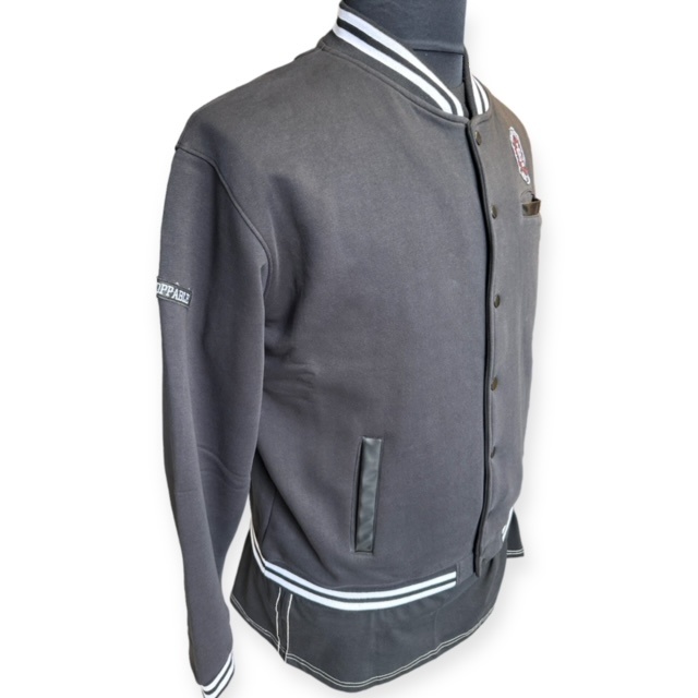 Eine moderne Baseballjacke in Schwarz mit kleinem Emblem auf der Vorderseite und dem Arm. Mit 2 Eingrifftaschen und einer Brusttasche.