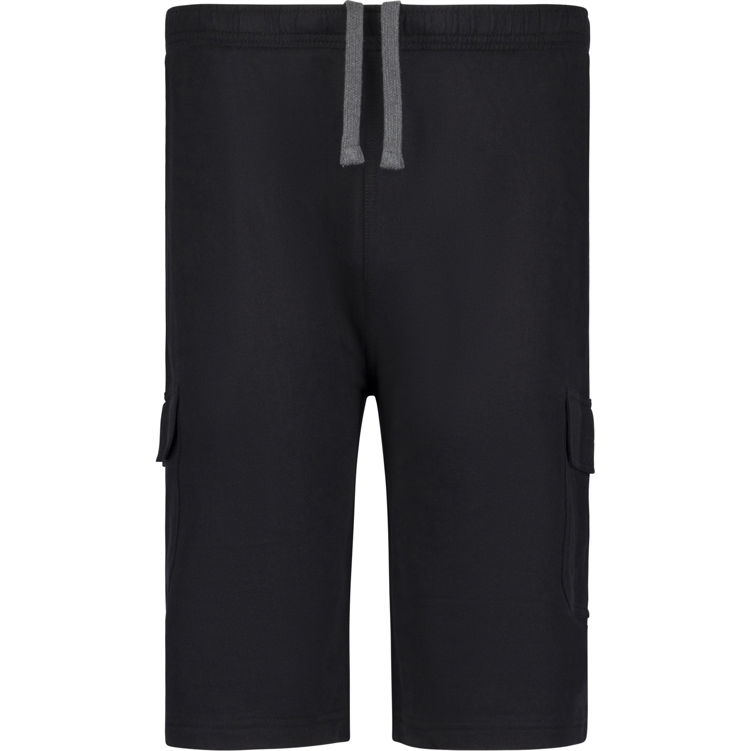 Cargo-Shorts aus Sweatpants-Stoff in Schwarz. Shorts haben Seitentaschen und 2 Cargotaschen auf beiden Seiten.
