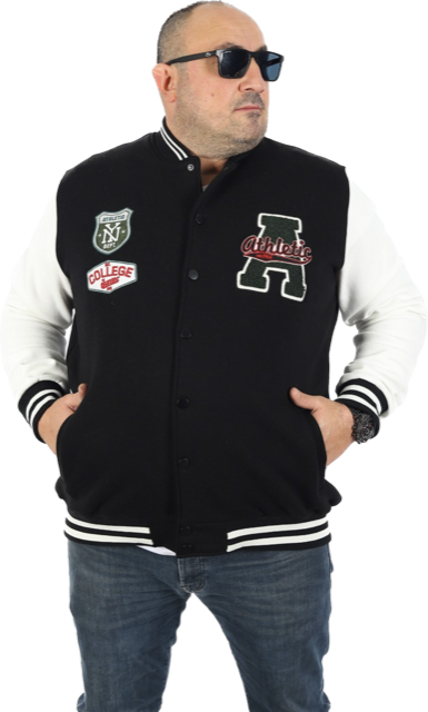 Eine coole Collegejacke in Schwarz mit weißen Ärmeln. Die Jacke hat verschiedene aufgedruckte Aufnäher und ist mit Taschen ausgestattet. Die Jacke ist mit einem Knopfverschluss ausgestattet.