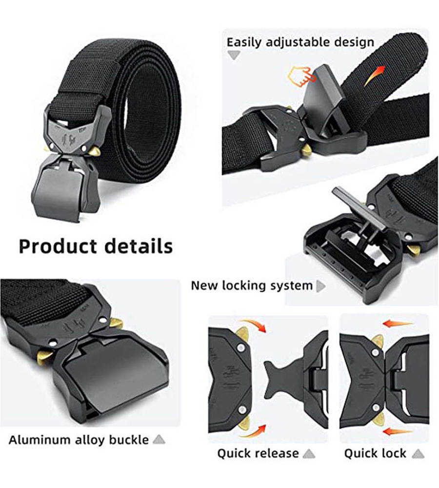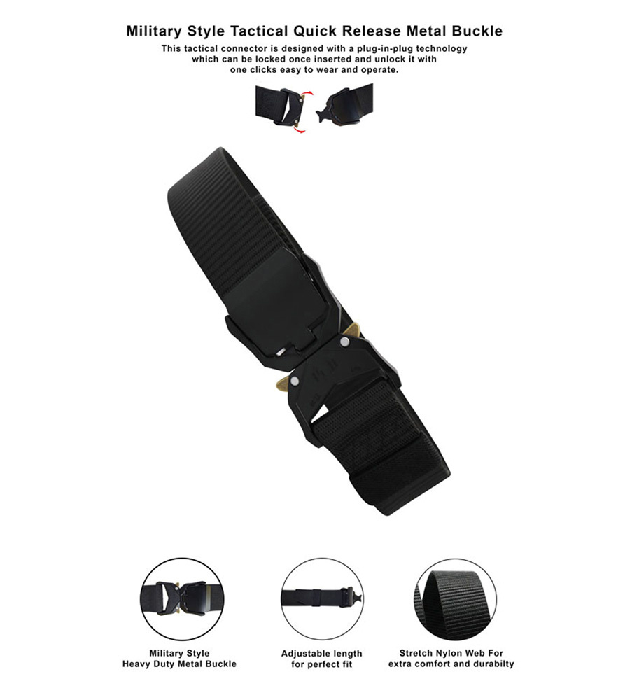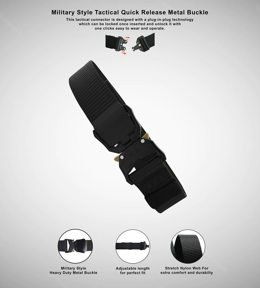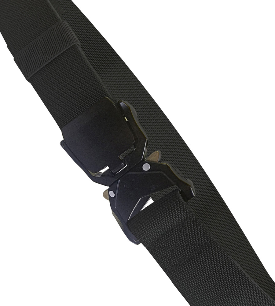 Ein elastischer taktischer Gürtel in Schwarz. Der Gürtel ist in der Länge verstellbar und verfügt über ein Klicksystem, sodass er sicher an seinem Platz bleibt.