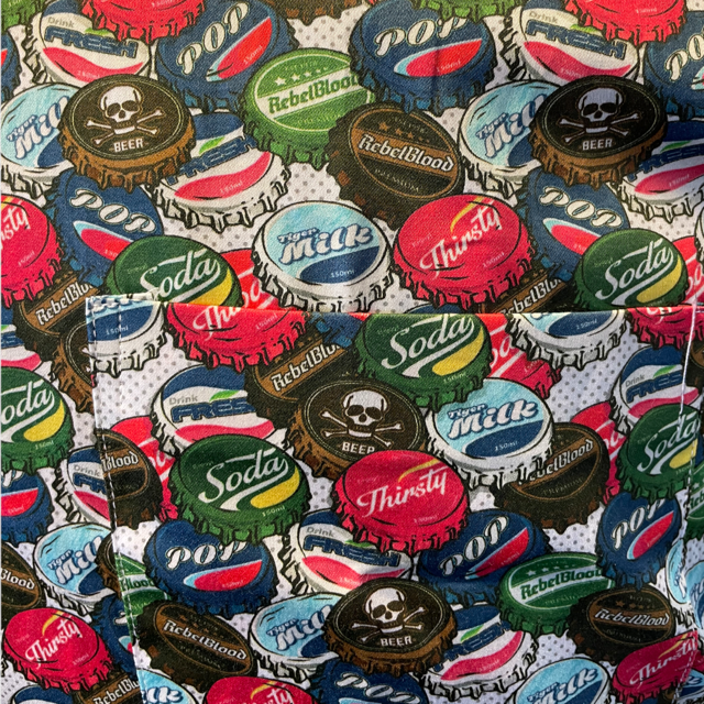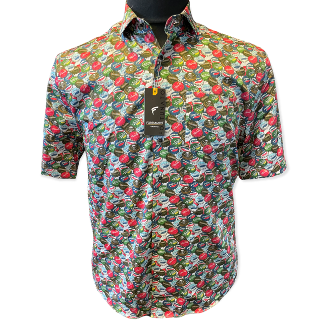 Ein sommerliches Kurzarmshirt der Marke Fortunato mit einem 3D-Druck von Kronkorken, das Shirt hat eine Brusttasche.