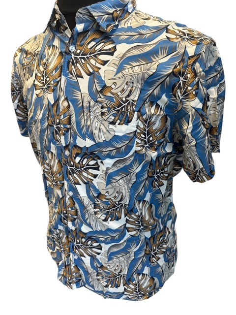 Ein Tropenhemd mit kurzen Ärmeln in der Farbe Himmelblau von der Marke Pre End, das Hemd hat eine Brusttasche.