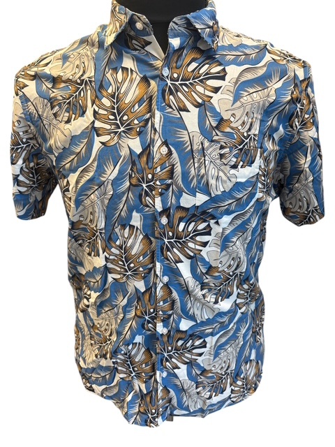 Ein Tropenhemd mit kurzen Ärmeln in der Farbe Himmelblau von der Marke Pre End, das Hemd hat eine Brusttasche.