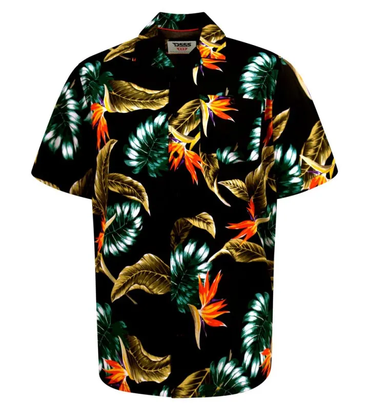 Modernes Hawaiihemd mit kurzen Ärmeln von D555. Das Hemd hat eine Brusttasche.