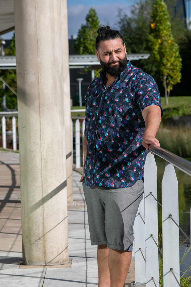 Ein modernes Kurzarmhemd mit Digitaldruck "Gitarren" Shirt hat eine Brusttasche und ist vom Label D555