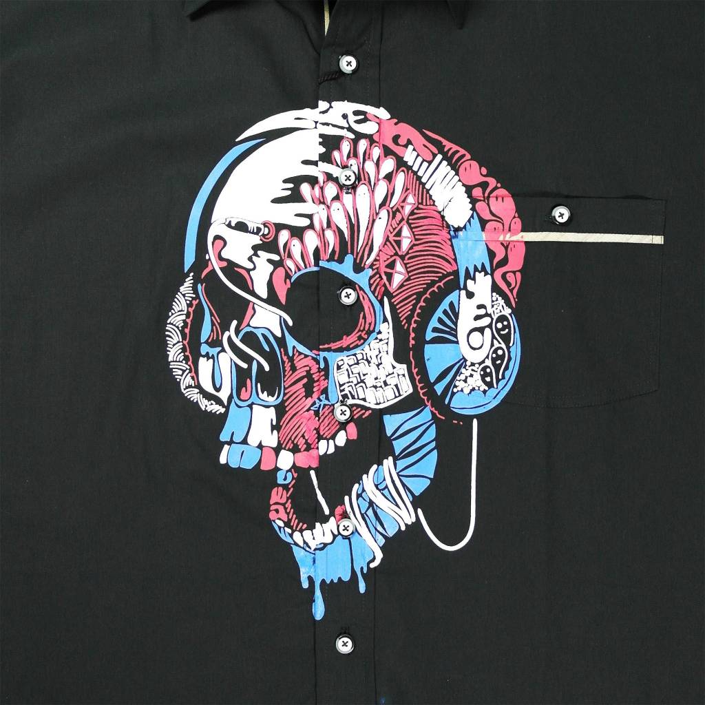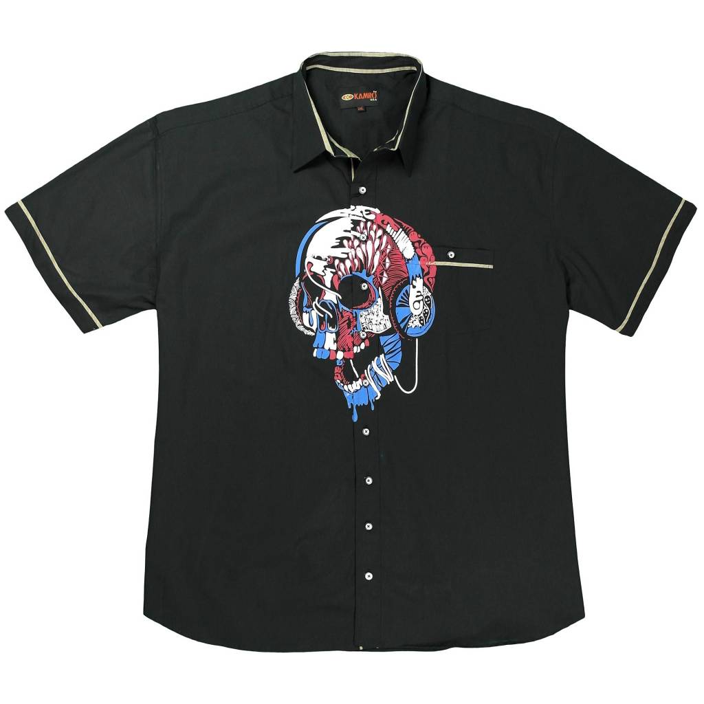 Cooles Shirt mit dem Aufdruck eines musikalischen Totenkopfs. Das Shirt hat eine moderne Paspelierung an Ärmeln, Halsausschnitt und Knöpfen auf der Vorderseite. Farbe: Schwarz. Besonderheiten: linke Brusttasche.