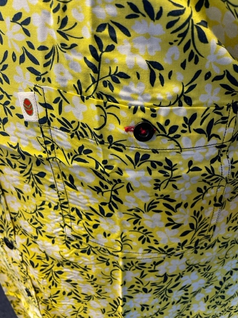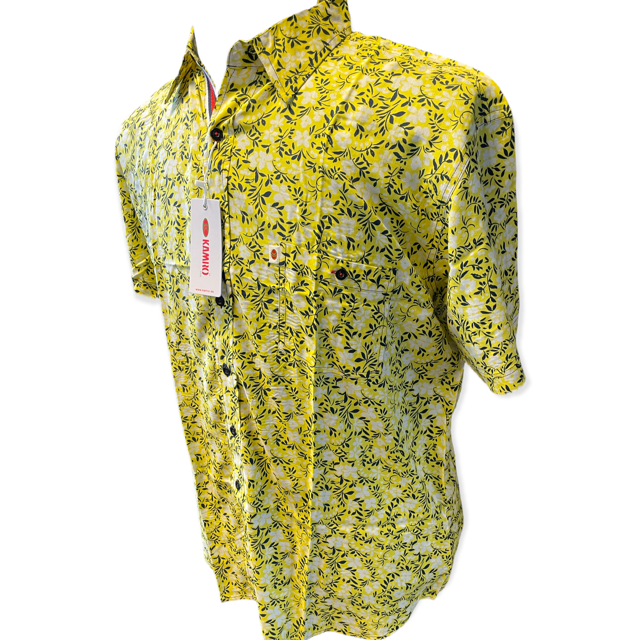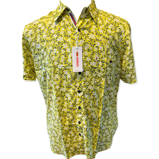 Ein sehr weiches und anschmiegsames Hemd der Marke Kamro in Gelb mit einem fröhlichen sommerlichen Blumenmotiv, das Hemd hat eine Brusttasche.