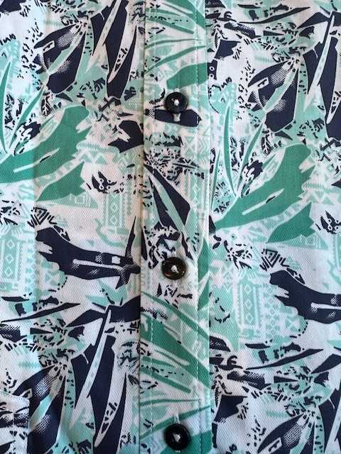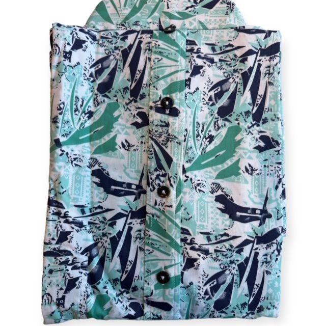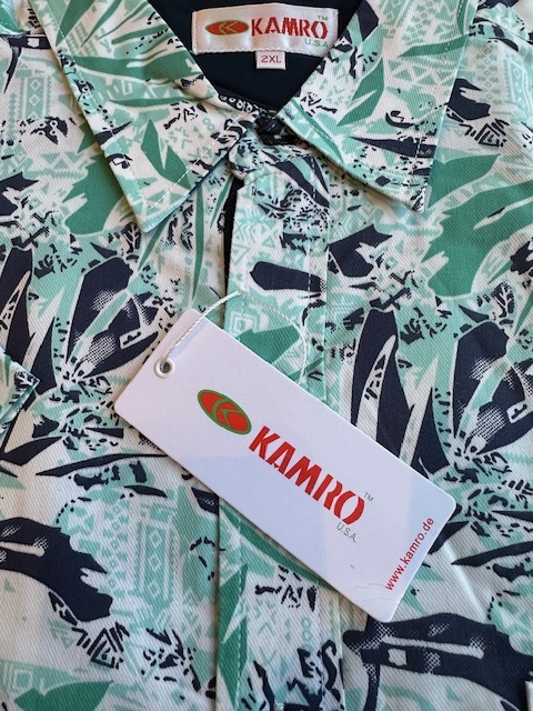 Ein tropisches Kurzarmhemd der Marke Kamro in der Farbe frisches Grün, das Hemd hat eine Brusttasche.