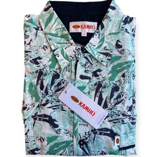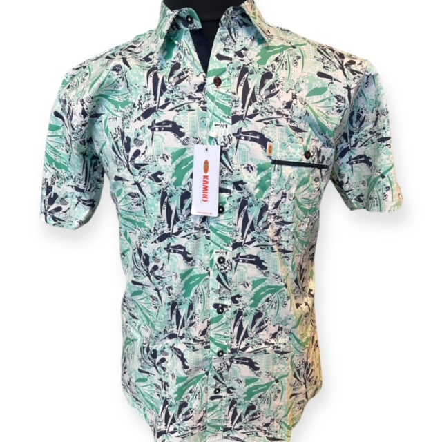 Ein tropisches Kurzarmhemd der Marke Kamro in der Farbe frisches Grün, das Hemd hat eine Brusttasche.