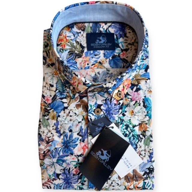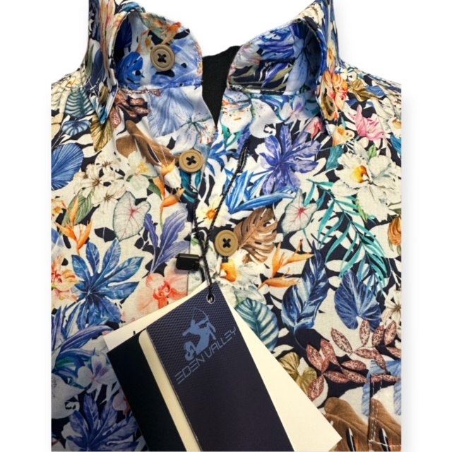 Ein fröhliches Sommershirt mit kurzen Ärmeln der Marke Eden Valley. Das Shirt hat einen 3D-Druck (tropische Atmosphäre) und eine Brusttasche.