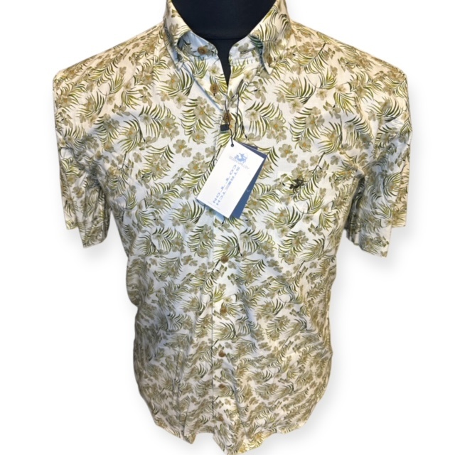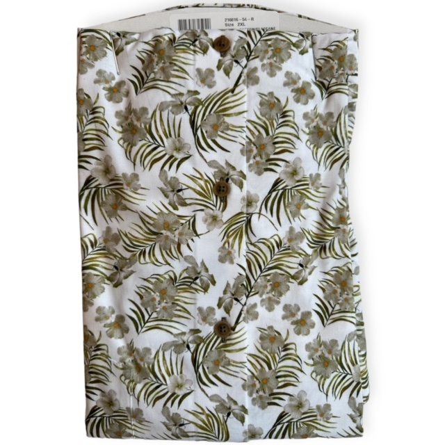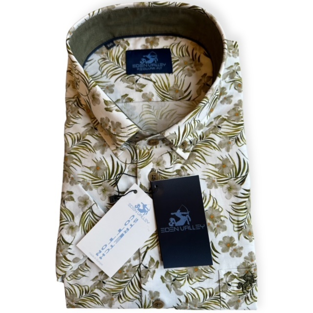 Ein Sommerhemd der Marke Eden Valley im 3D-Druck (tropische Pflanzen). Das Hemd hat einen Button-Down-Kragen und eine Brusttasche.