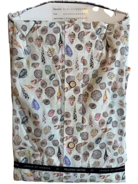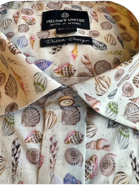 Ein Sommerhemd in Off-White mit einem 3D-Druck aus farbigen Muscheln, das Hemd hat eine Brusttasche.
