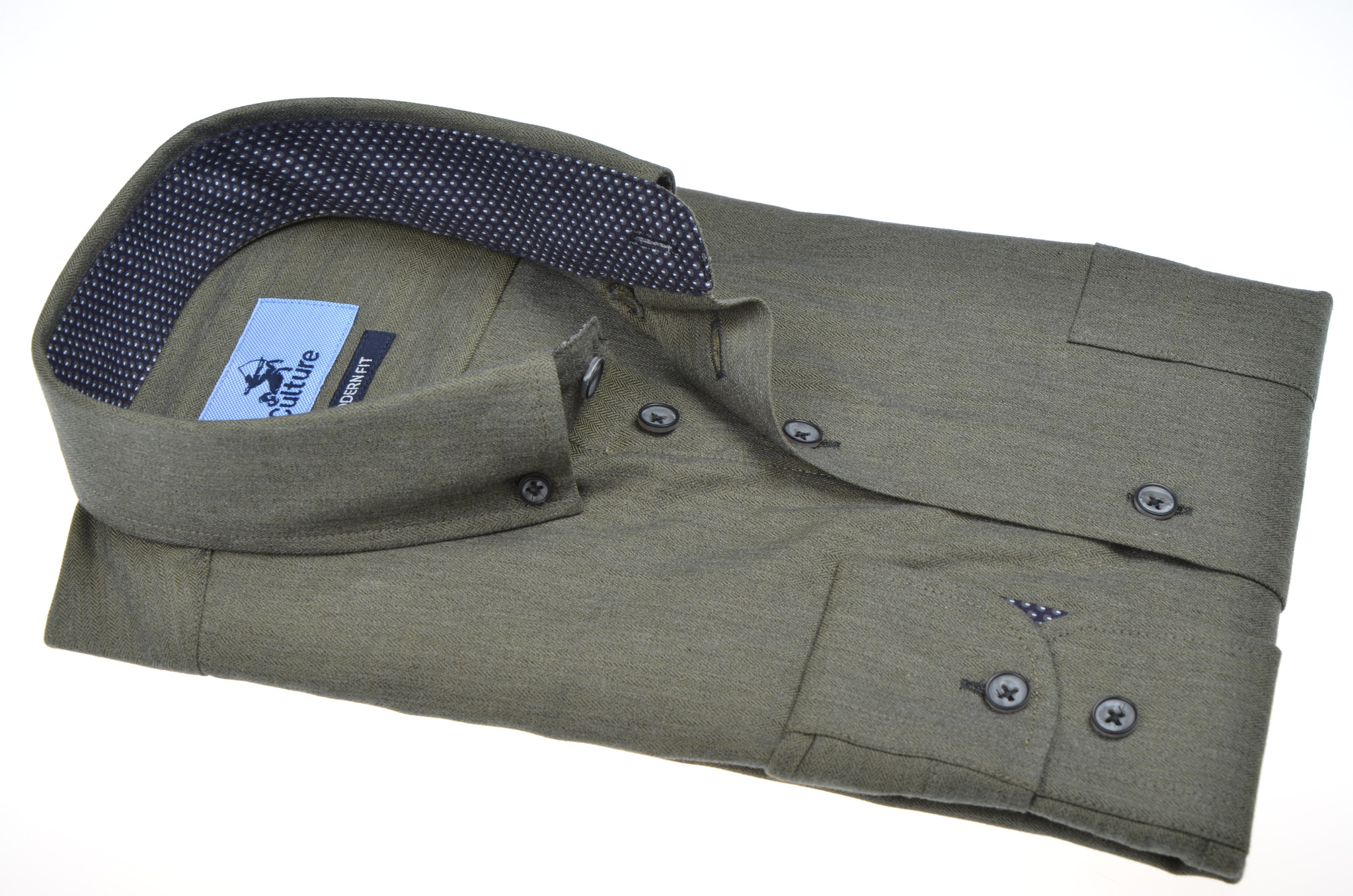 Ein modernes Langarmhemd der Marke Culture in der Farbe Moosgrün. Das Hemd hat eine Brusttasche und farbige Knöpfe. Normale Passform, 100 % Baumwolle.