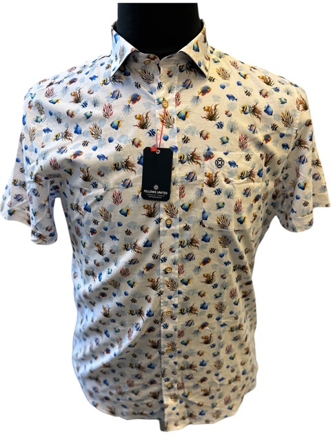 Ein modernes Sommershirt mit kurzen Ärmeln und Seefisch- und Korallen-Print, Shirt ist vom Label Fellows United.