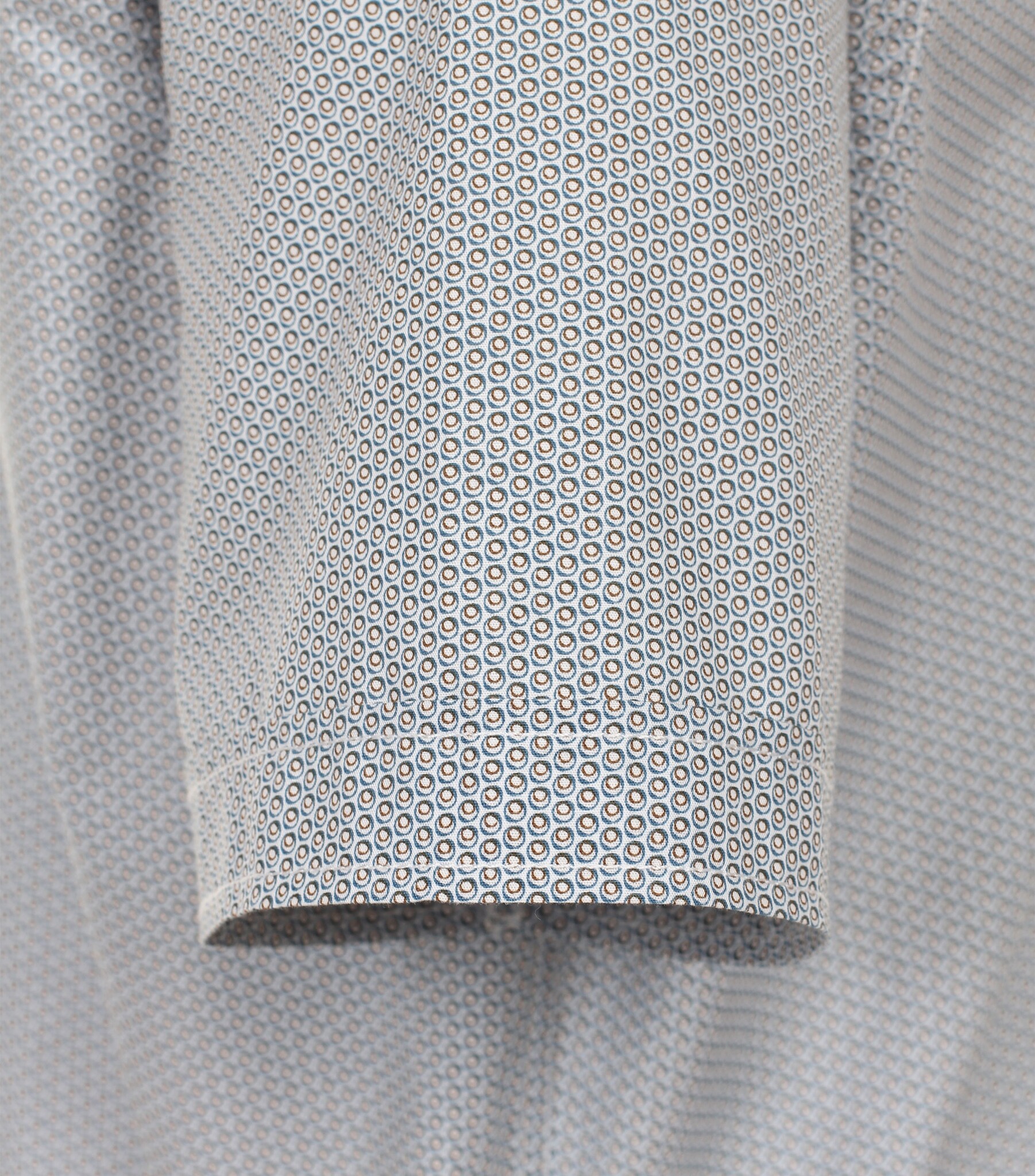Ein kurzärmliges Hemd mit feinem Punktedruck (hellbraun), Hemd hat Button-Down-Knöpfe und eine Brusttasche.