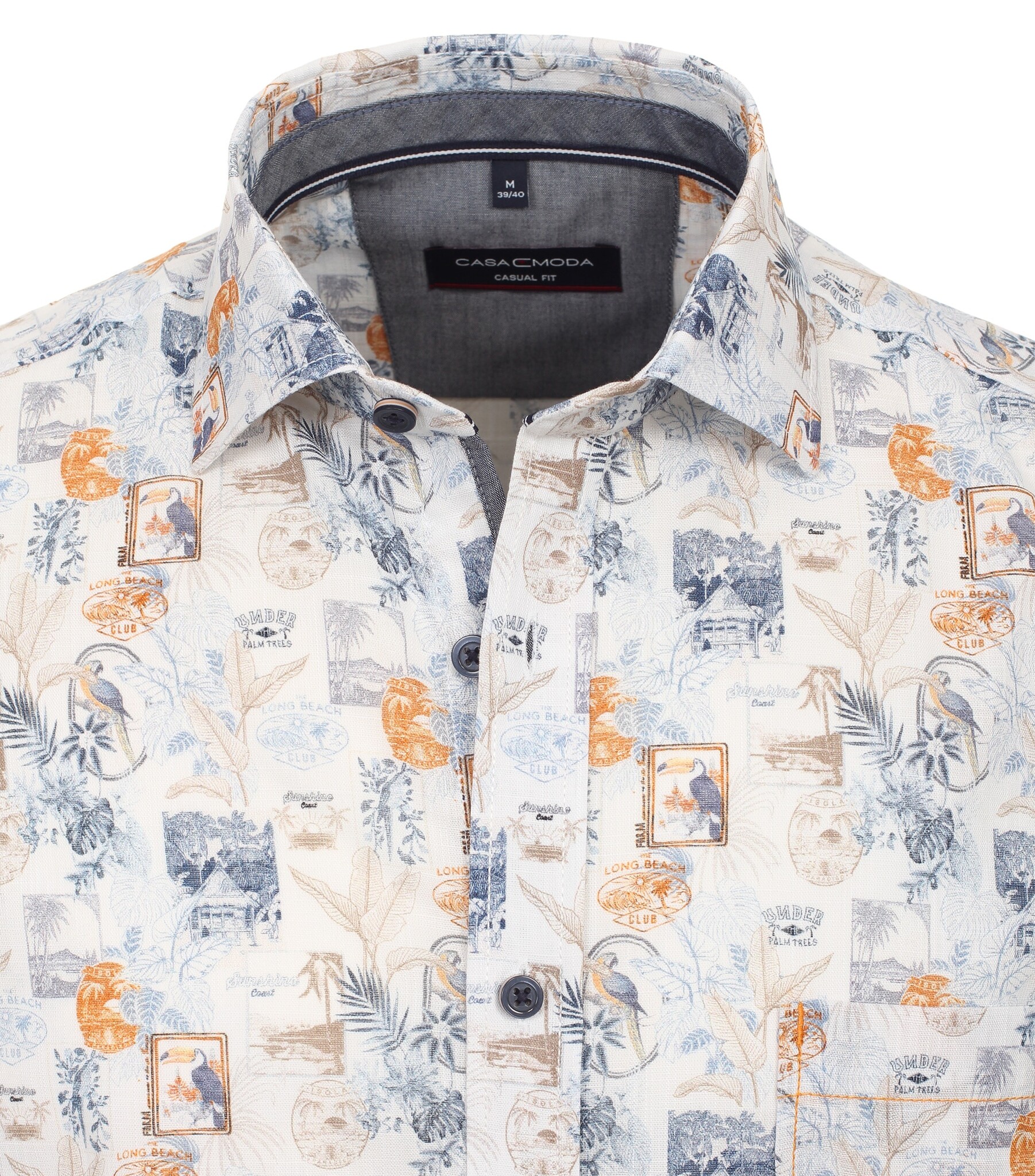 Ein tropisches Kurzarmhemd mit einem Aufdruck von Vögeln und Pflanzen. Das Hemd hat eine Brusttasche.