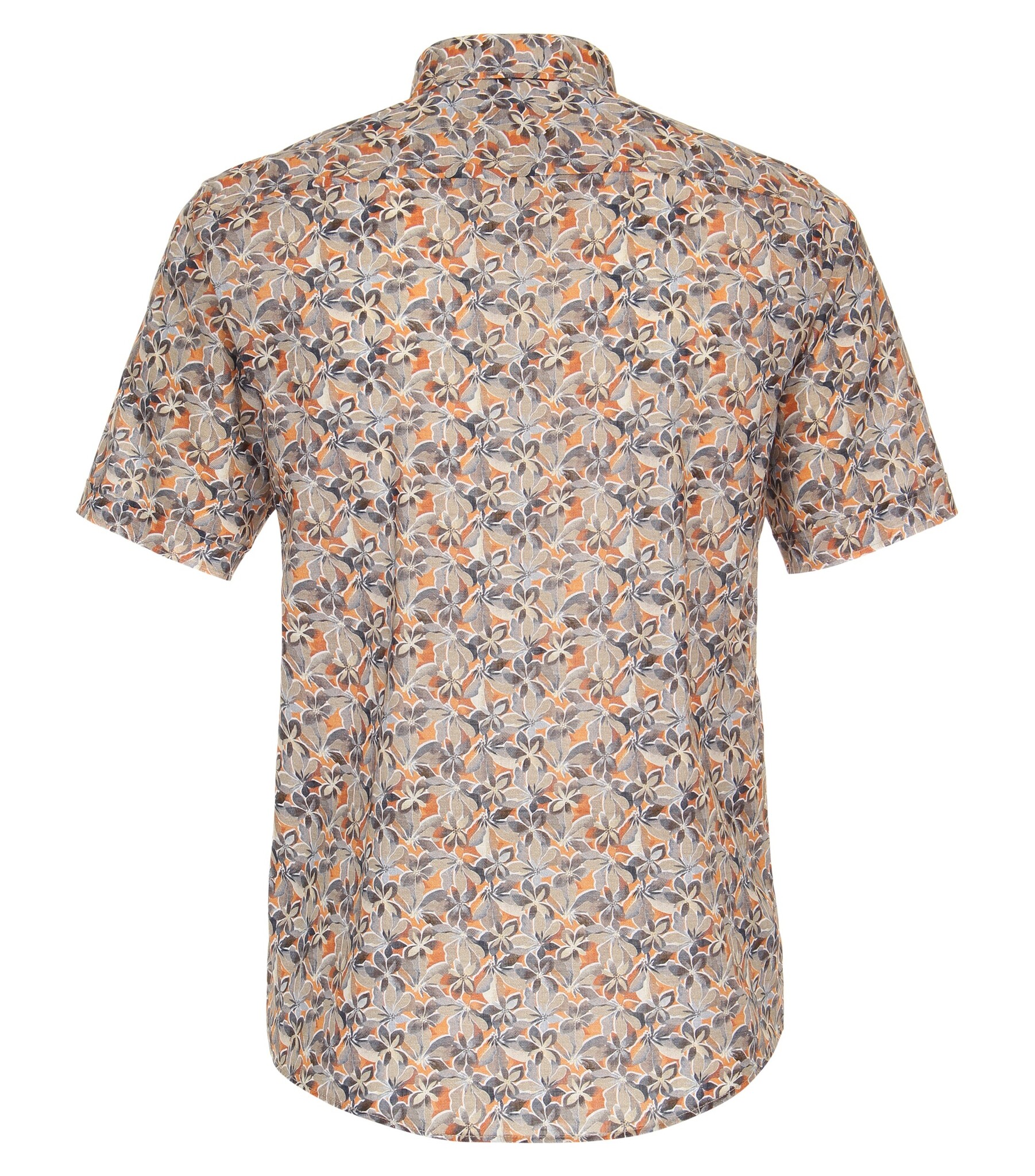 Ein Sommerhemd mit kurzen Ärmeln und Digitaldruck (Blumen) in der Farbe Orange/Beige. Das Hemd hat eine Brusttasche und einen Button-Down-Kragen.