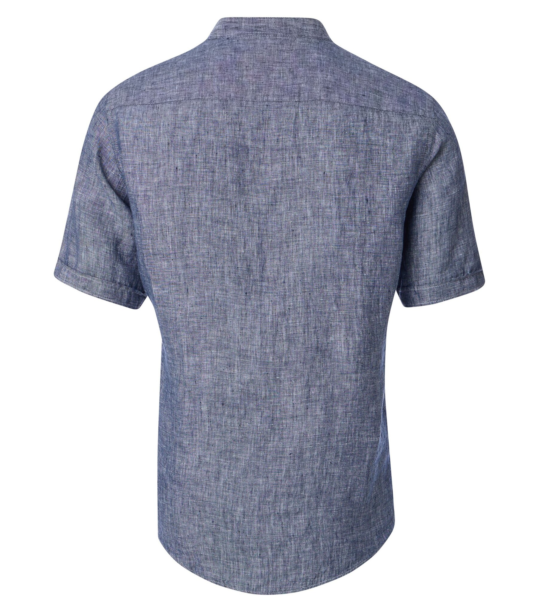 Ein schönes Sommerhemd aus 100 % Leinen in Blau mit offenem Kragen, das Hemd hat eine Brusttasche.