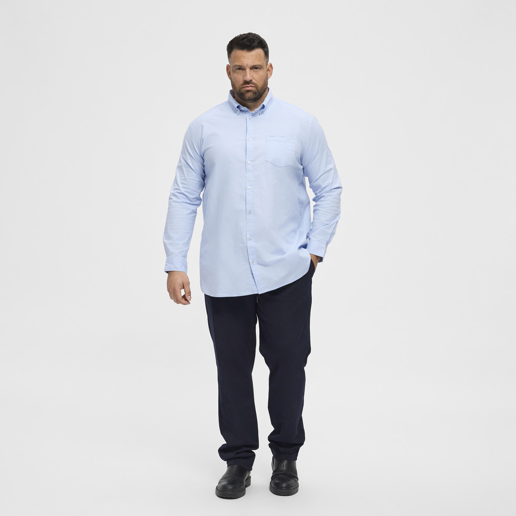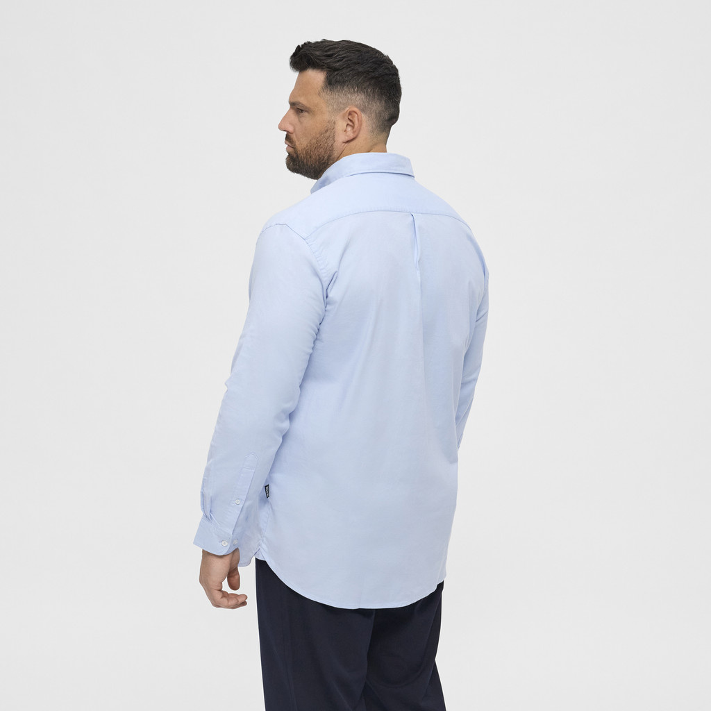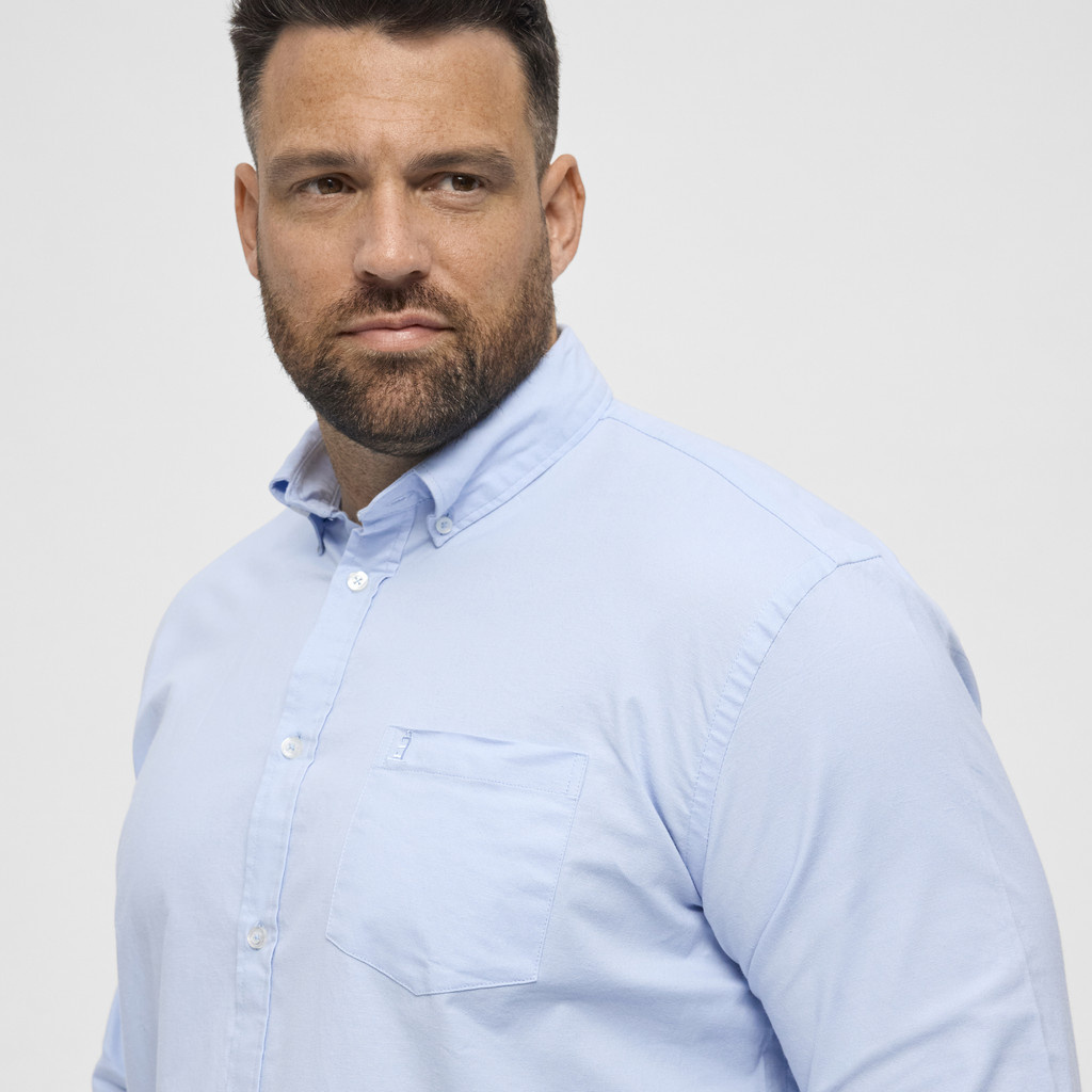 Ein Oxford Langarmhemd in Hellblau der Marke North56, das Hemd hat eine Brusttasche auf der linken Seite und hat Button-Down-Knöpfe im Kragen.