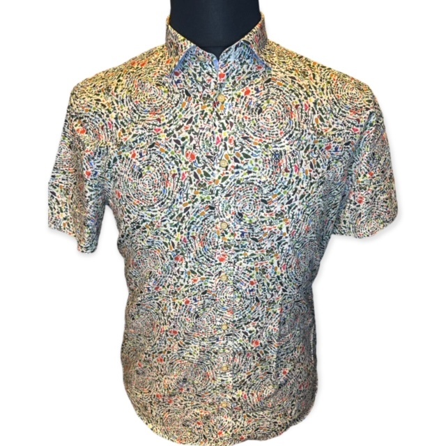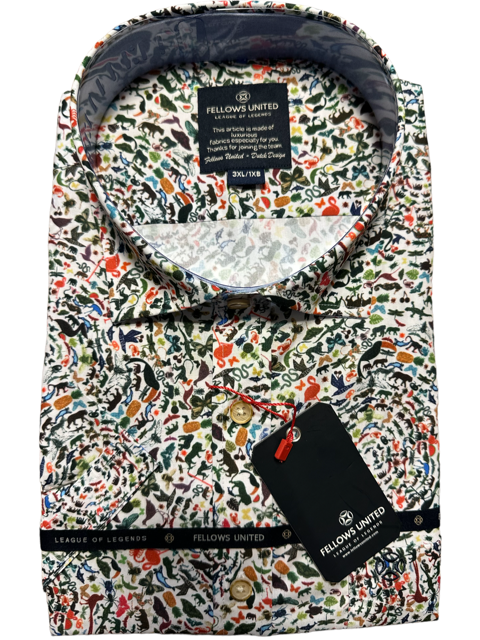 Ein Sommerhemd mit kurzen Ärmeln der Marke Fellows United in mehreren Farben mit fröhlichem Tierdruck. Das Hemd hat eine Brusttasche und einen versteckten Button-Down.