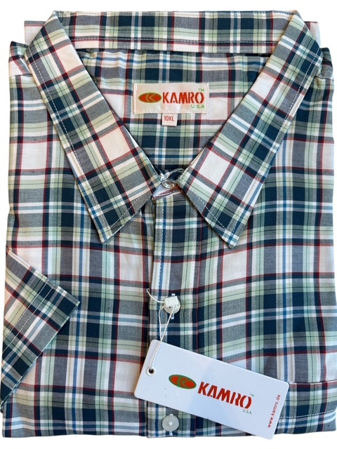 Ein Sommerhemd mit kurzen Ärmeln im Rautenmuster (Farben Blau, Grün, Rot und Weiß) der Marke Kamro, das Hemd hat eine Brusttasche.