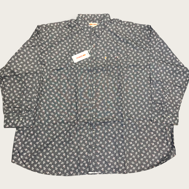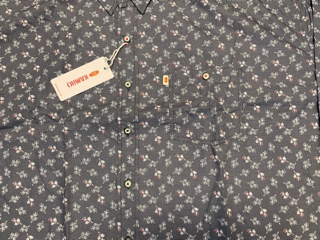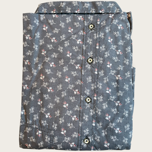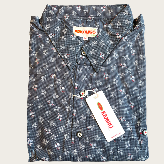 Ein Langarmshirt der Marke Kamro in Blau mit feinem Blumenmotiv, das Shirt hat eine Brusttasche.