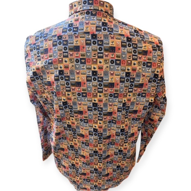 Ein stylisches Langarmshirt der Marke Fellows United in der Farbe Ocker. Das Shirt hat einen 3D-Aufdruck verschiedener Oldschool-Musikbands und ist mit einer Brusttasche versehen.