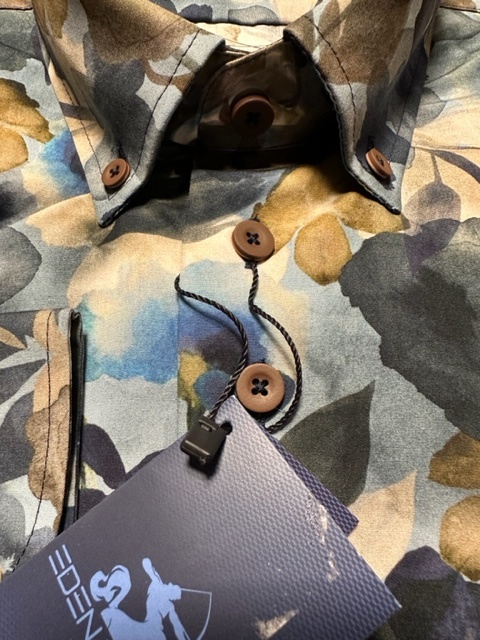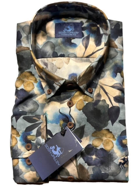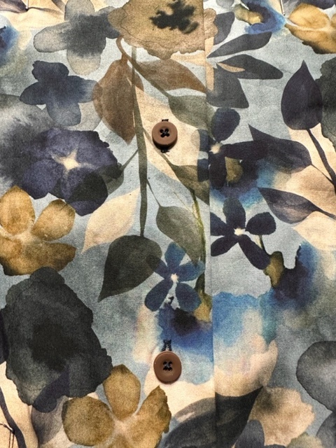 Ein modernes Langarmshirt der Marke Eden Valley, das Shirt hat einen wunderschönen tropischen Pflanzendruck in Blau/Bronze und verfügt zusätzlich über eine Brusttasche.