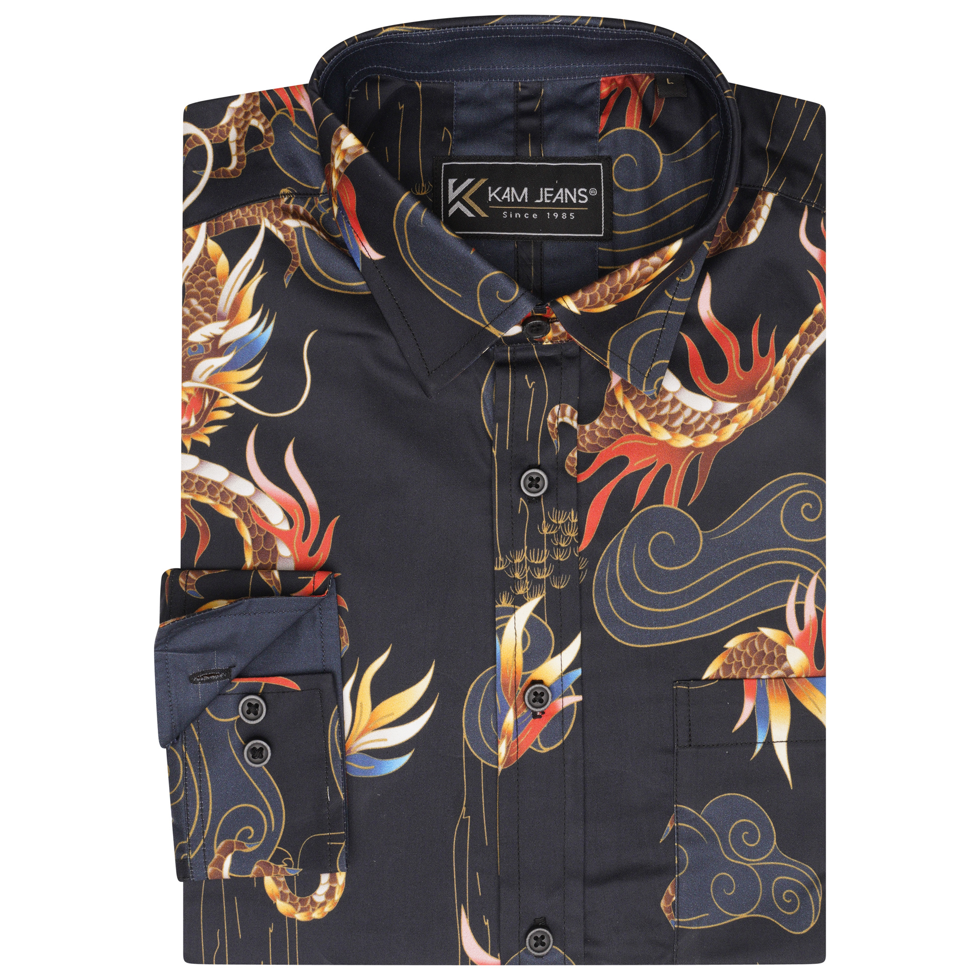 Ein Langarmshirt der Marke KamJeansWear in Schwarz mit 3D-Aufdruck eines chinesischen Drachen. Beachten Sie, dass es keine Brusttasche hat.