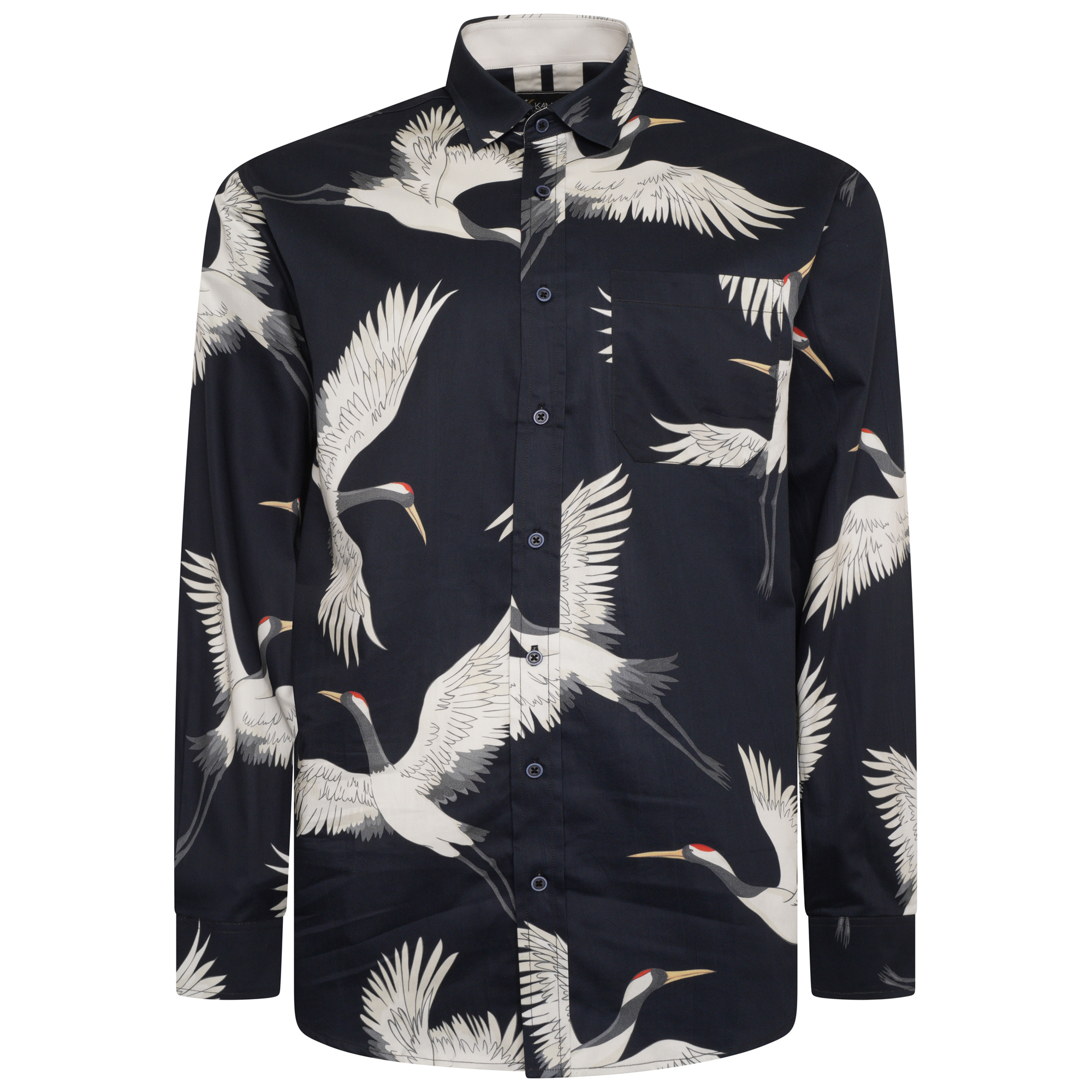 Ein modernes Hemd der Marke KamJeansWear in Schwarz. Das Hemd hat einen 3D-Aufdruck eines Kranichs. Beachten Sie, dass es keine Brusttasche hat.