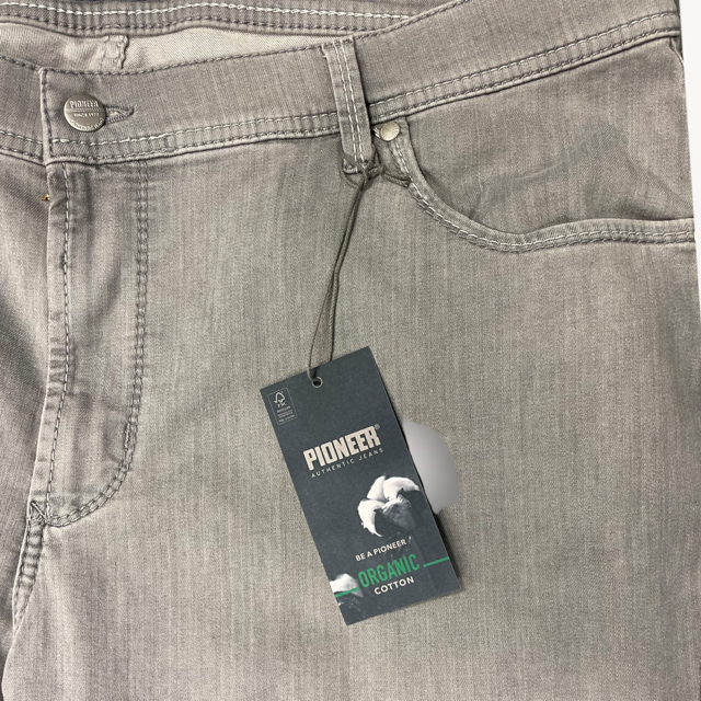 Eine Sommer-Megaflexhose der Marke Pioneer in der Farbe Hellgrau. Die Hose fühlt sich weich an und ist aufgrund des zusätzlichen Stretchanteils sehr bequem.