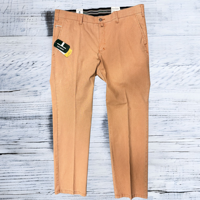 Eine moderne Sommerhose von Club of Comfort in der Farbe Orange/Salm, die Hose hat 2 Seitentaschen und 2 Gesäßtaschen mit Knopfverschluss.