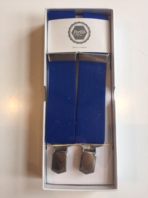 Hosenträger mit 2 Klemmen der Marke Portia in der Farbe Königsblau in der Größe 130 cm. Hosenträger hat breite und stabile Klemmen.