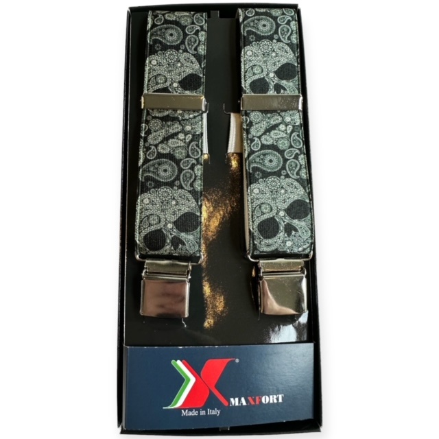 Grüne Hosenträger mit Skelett-Aufdruck. Die Hosenträger sind mit breiten, stabilen Clips ausgestattet, damit Ihre Kleidung am richtigen Platz bleibt.