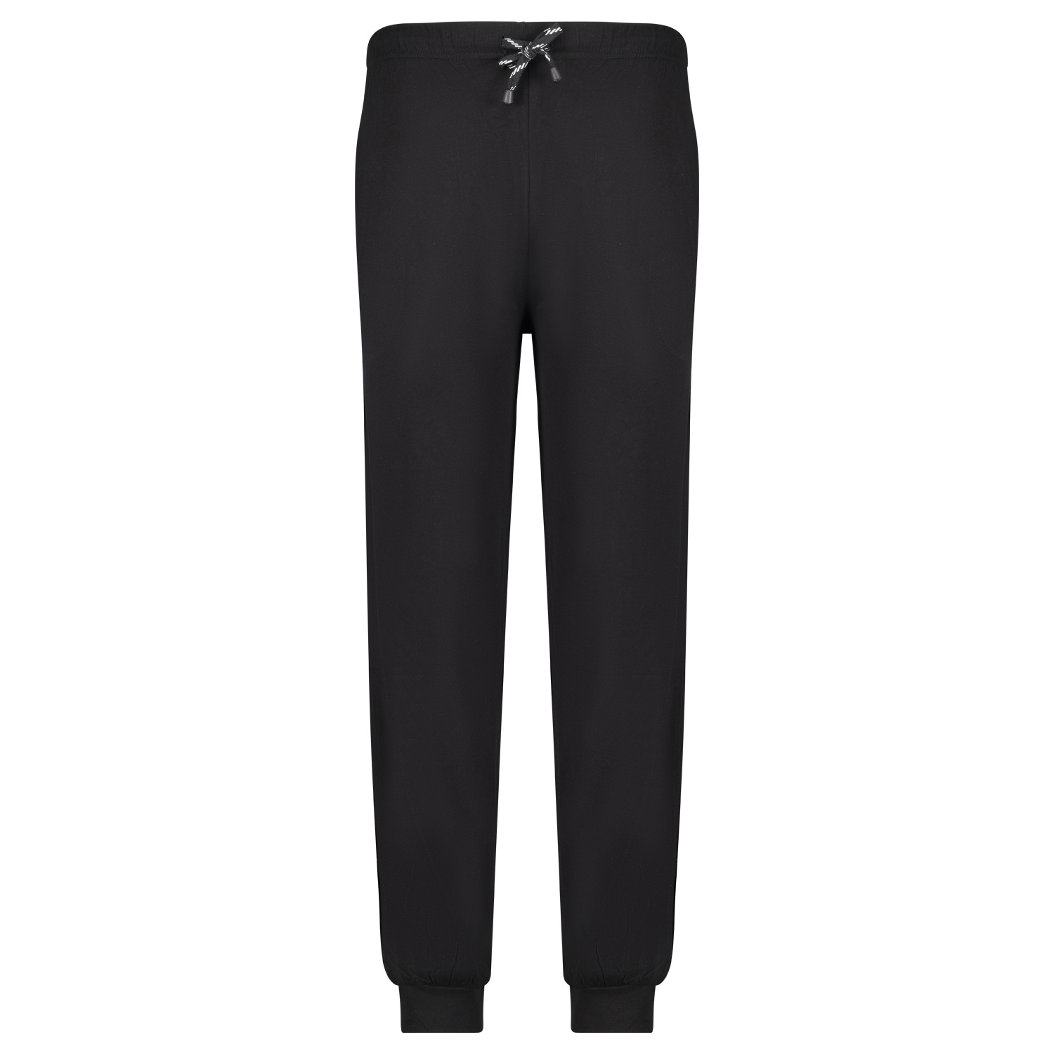 Pyjamahose lang uni in schwarz mit Bündchen und 2 Seitentaschen sowie einer Gesäßtasche und Kordel. Beine haben einen Gummizug.