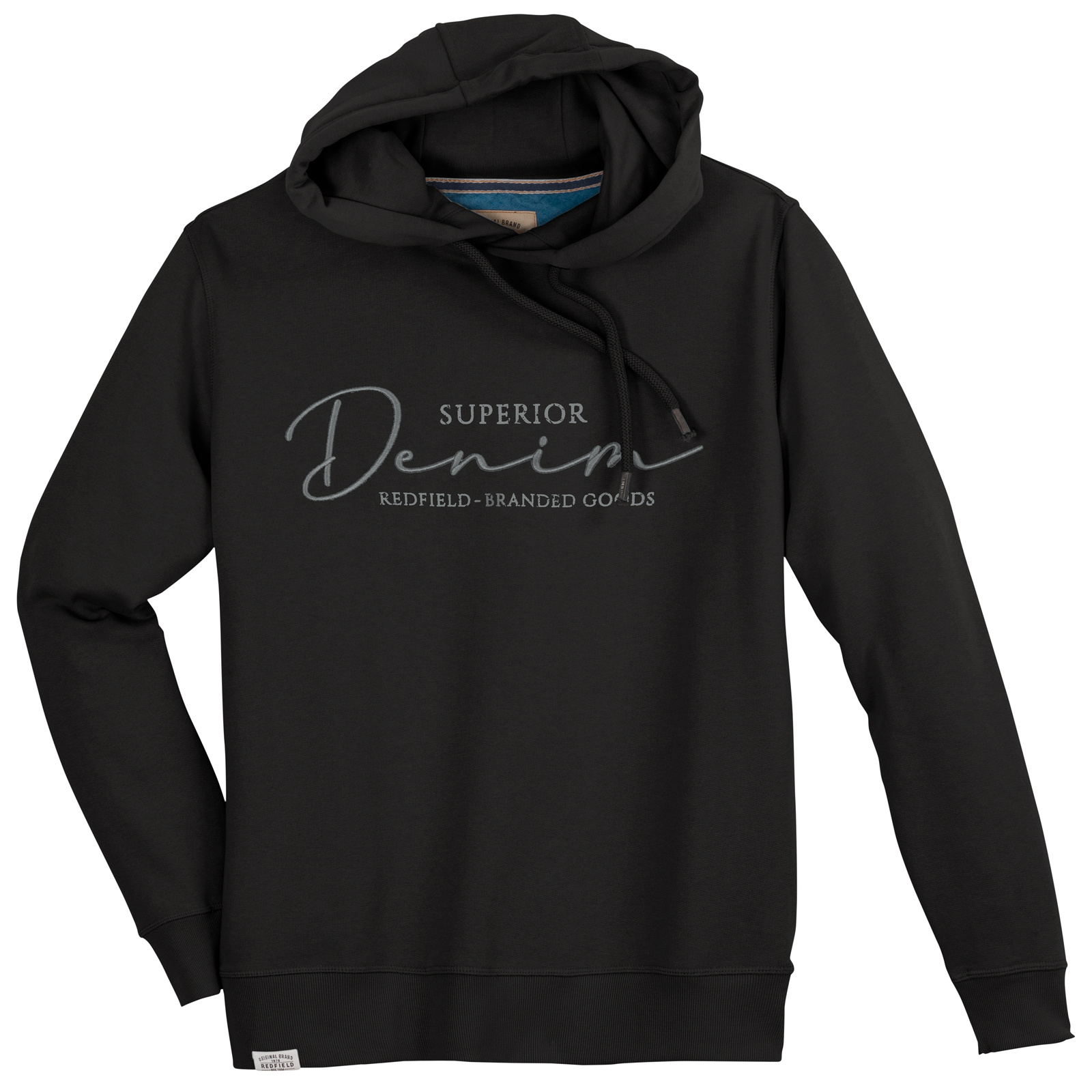 Ein moderner Hoodie der Marke Redfield in Schwarz mit dem Aufdruck auf der Vorderseite „Superior Denim“
